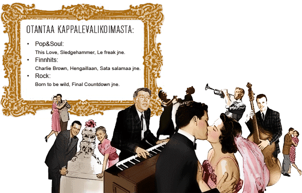 Hirvihaara Quartet Tilaisuuteen kuin tilaisuuteen soveltuva kompakti 4-henkinen peruskokoonpano (voc/keys, gtr, basso ja rummut), jonka tahdissa onnistuu pyörähtely niin perinteisemmän tanssimusiikin kuin modernimmankin jytän tahtiin. Mikäli haluatte kuulla juhlissanne lempikappaleenne kertokaa siitä meille ja lisäämme sen ohjelmistoomme. |
